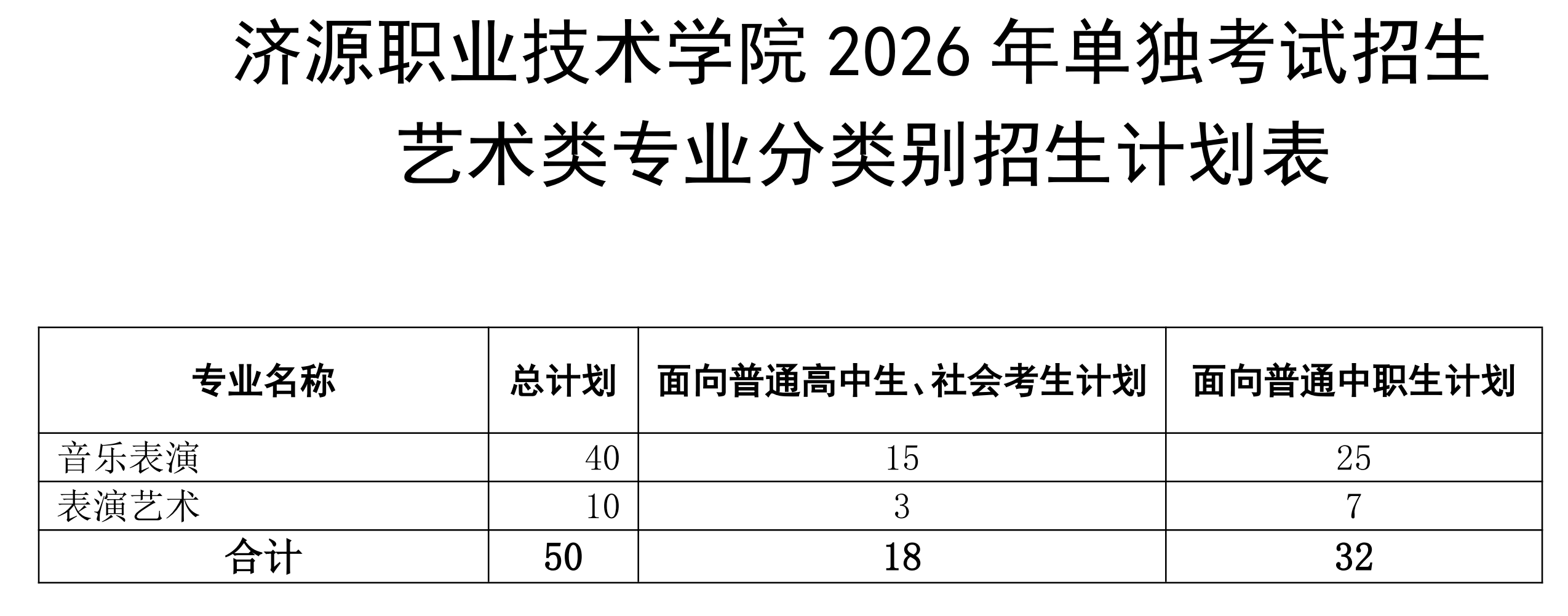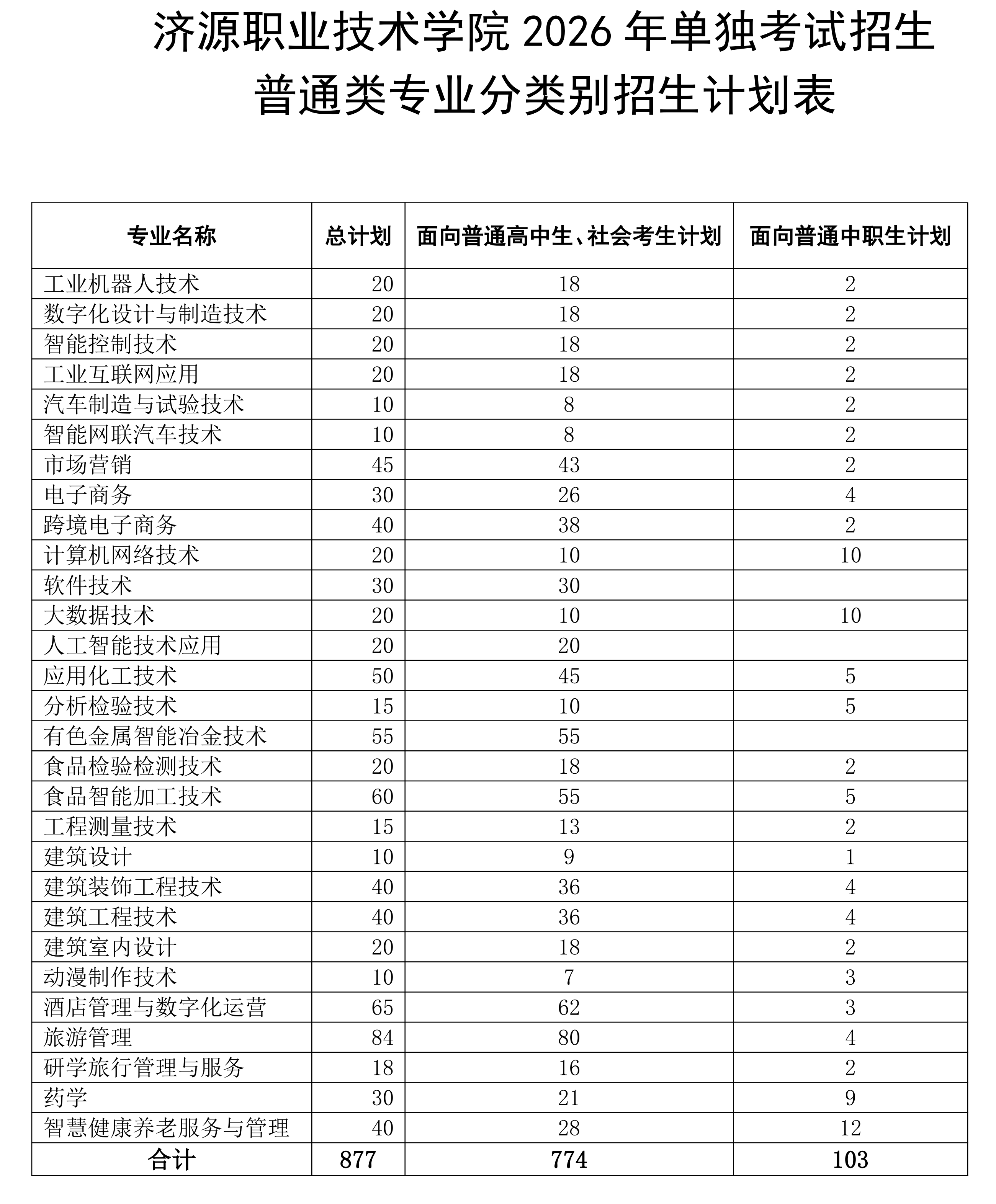 济源职业技术学院2026年单独考试招生计划